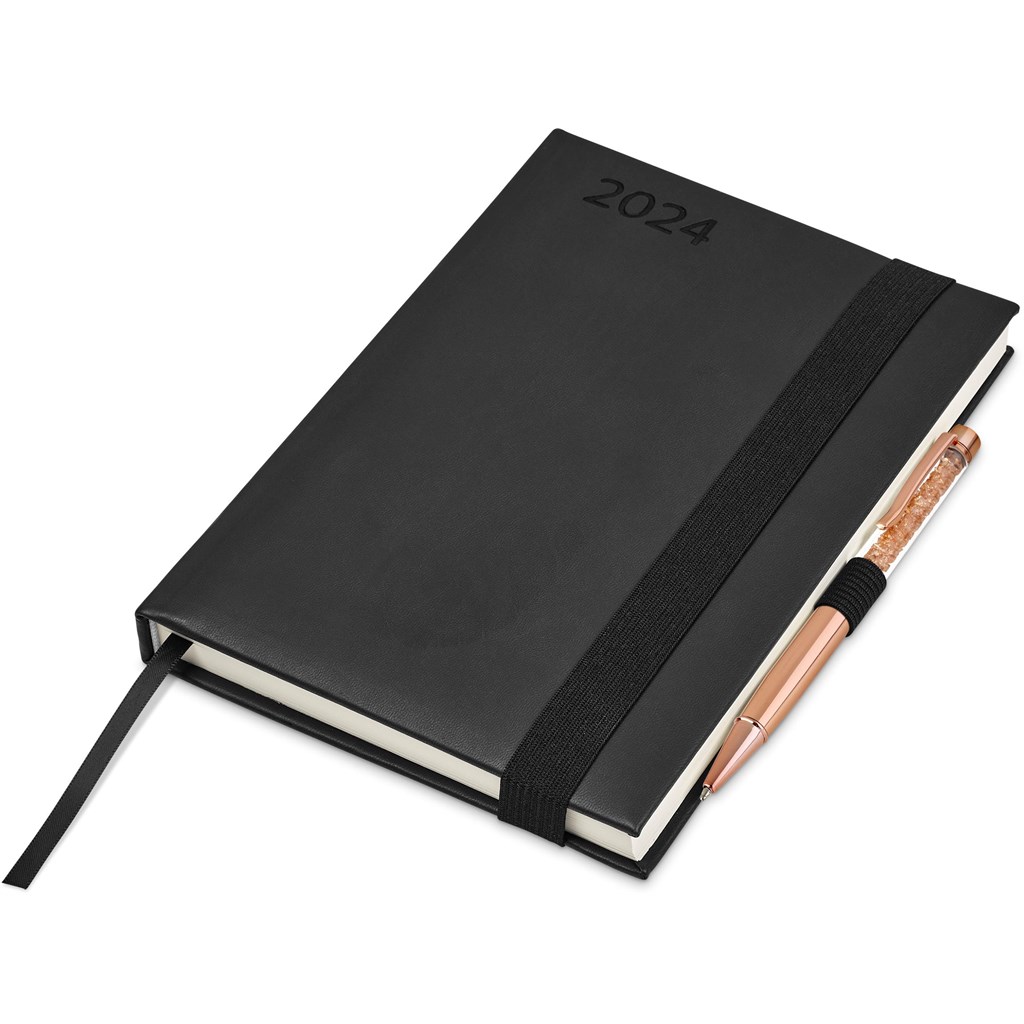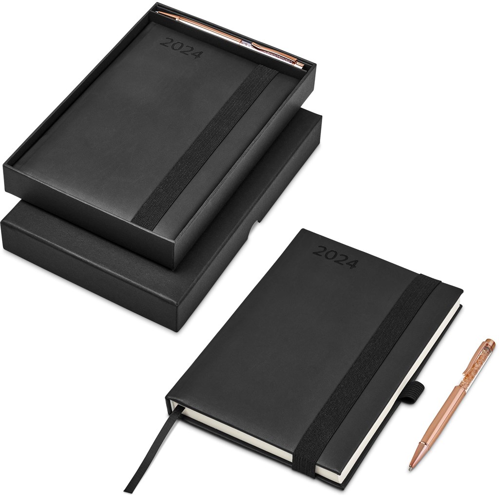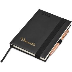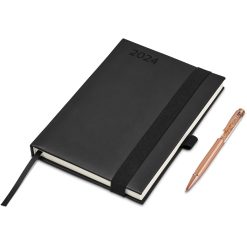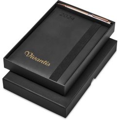 Why not add a glamorous touch to your diary gift this year, with this diary and ball pen set? This set includes a black Advantage A5 diary and a chromed rose gold ball pen, packaged together in a matte black, rigid 2-piece gift box.