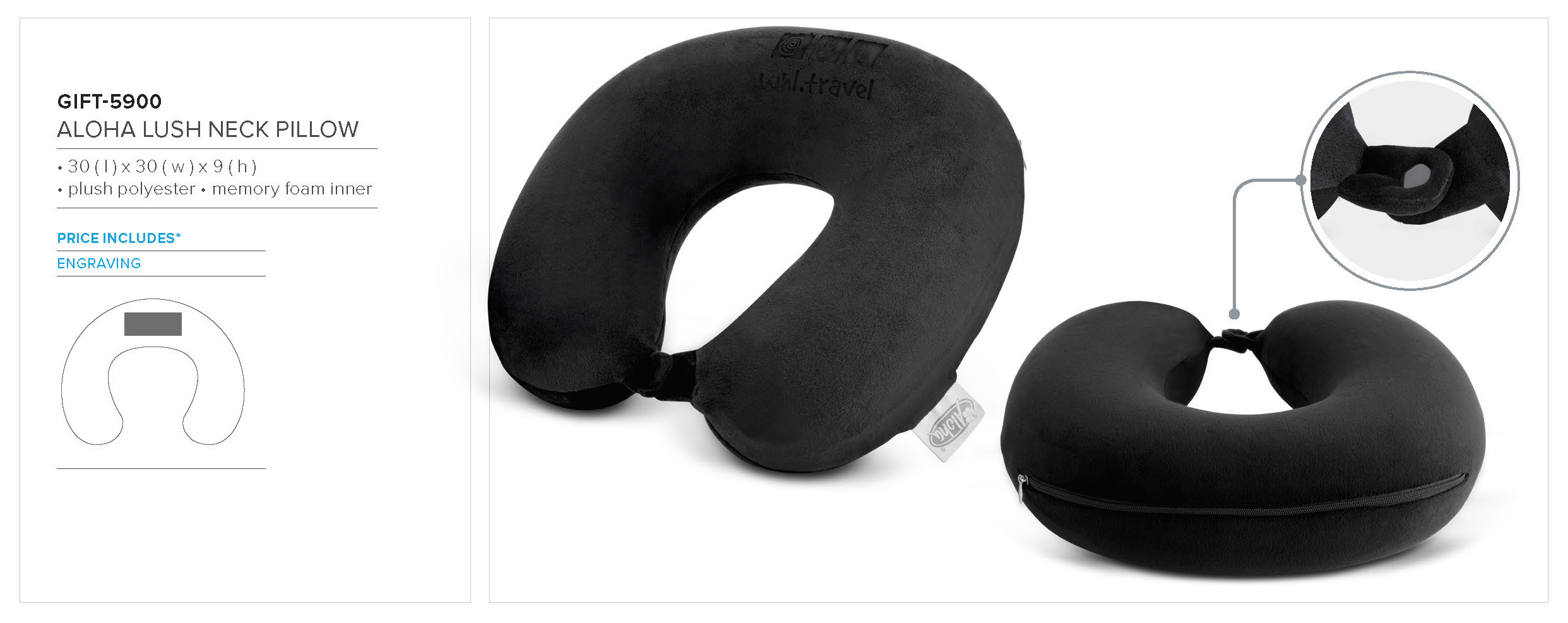 It has been made from a high-density memory foam which enhances comfort and the curved design provides head and neck support. It features a plush zip-up removable cover that is machine washable and can be embroidered with your logo or design.