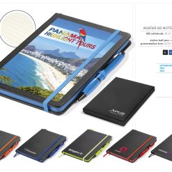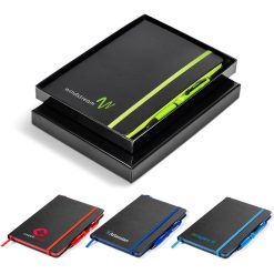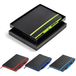 For a well-presented, matching notebook and pen set at a reasonable price, look no further than this set. The colour of the pen barrel matches the painted page edges and elastic closure, and a matching branding on the notebook will finish the set off nicely.