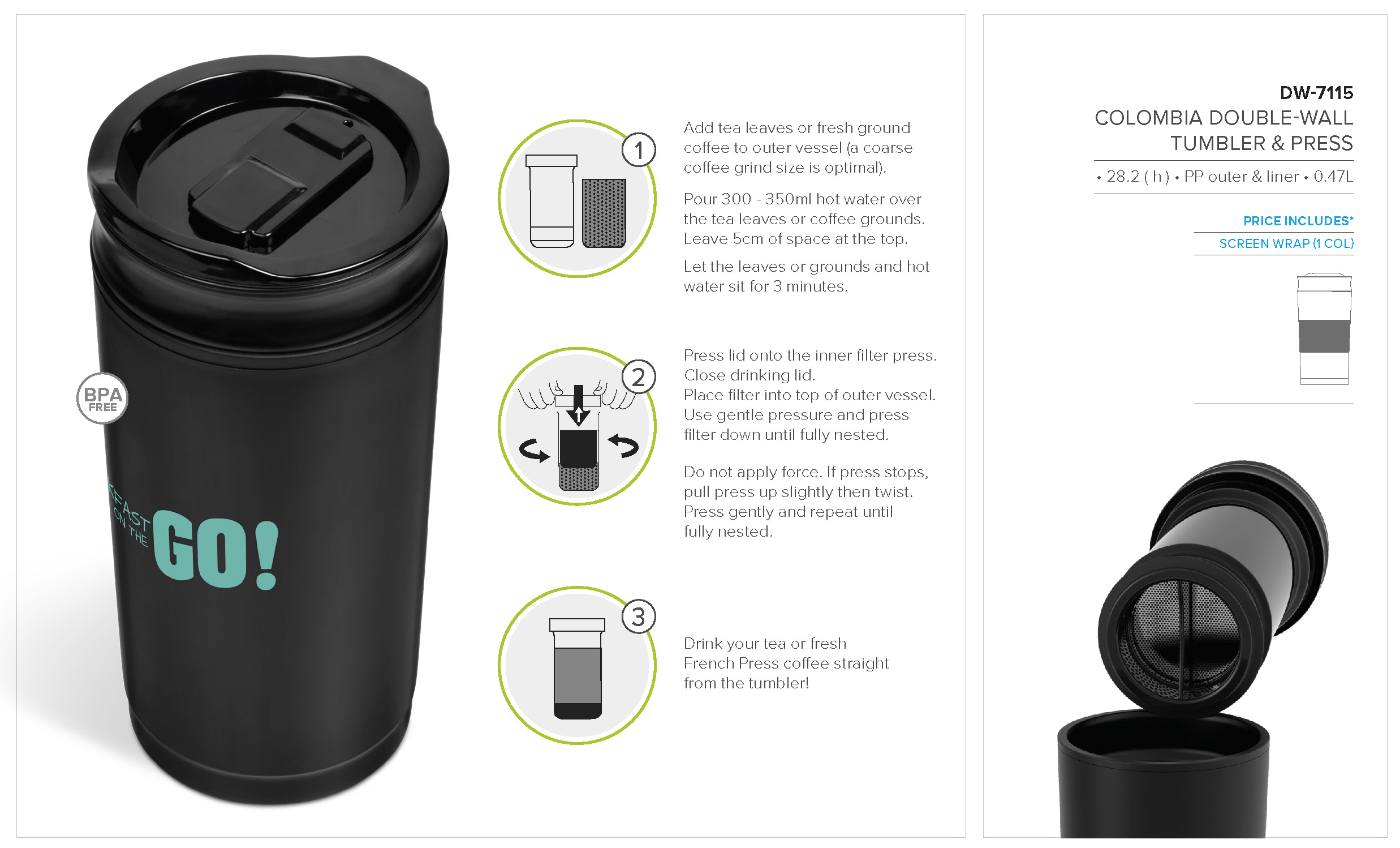 Colombia Plastic Double-wall Tumbler & Press – 470ml