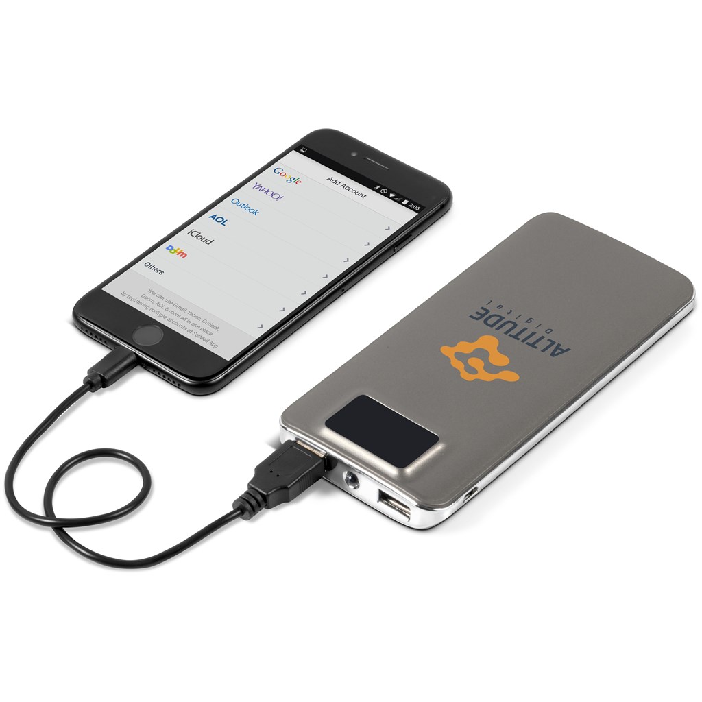 This power bank features a small torch. It has a substantial 10,000 mAh battery, with a power indicator display so that you know how much charge it has left