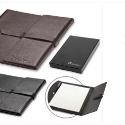 The textured PU surface and the strap closure give this folder a classic look and feel, which can be enhanced by subtle deboss branding.